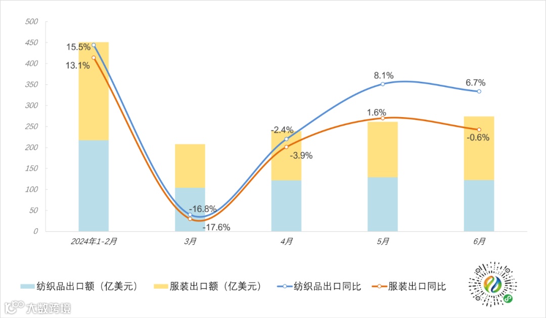 根据海关总署今日统计快讯,今年上半年,全国纺织品服装出口继续保持稳定恢复态势。以美元计,1~6月纺织品服装累计出口1431.8亿美元,同比增长1.5%。其中纺织品出口693.5亿美元,同比增长3.3%;服装出口738.3亿美元,与上年同期基本持平。