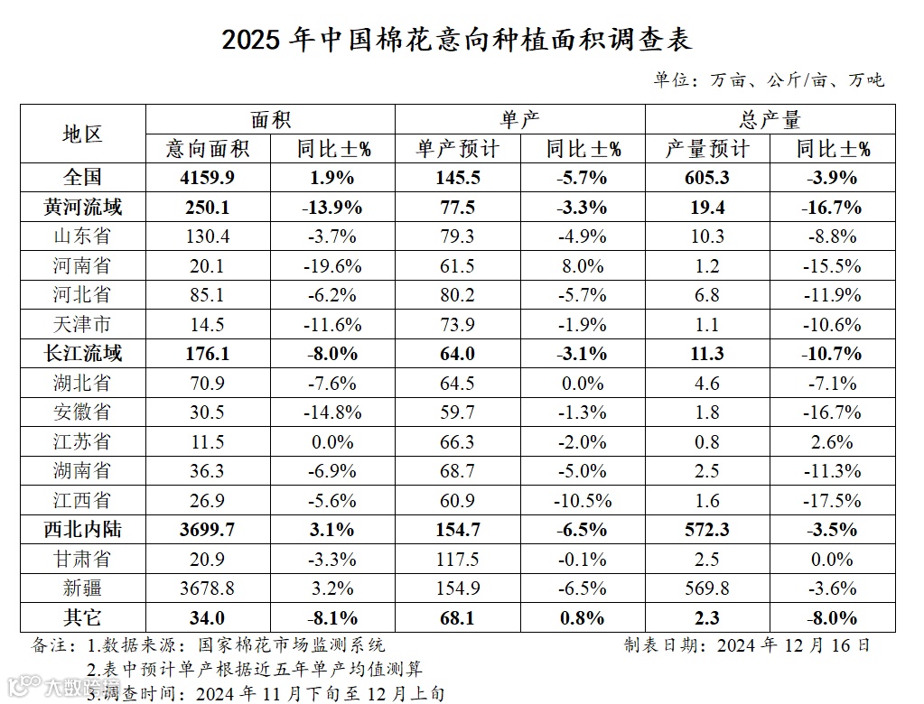2025年中国棉花意向种植面积同比增加1.9%