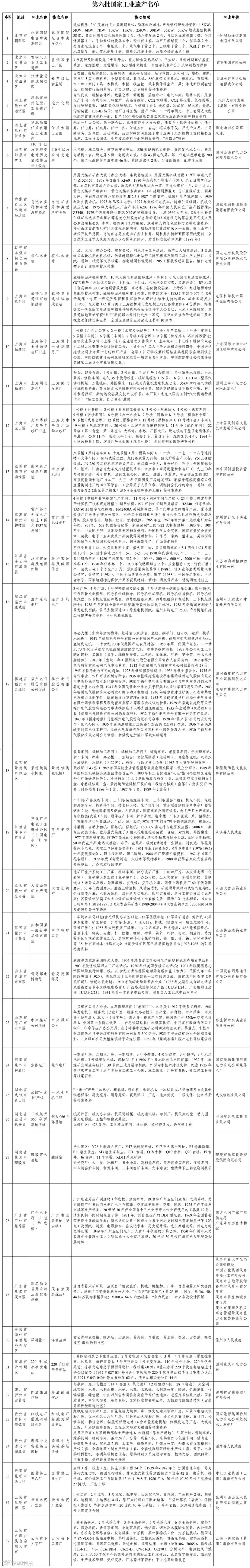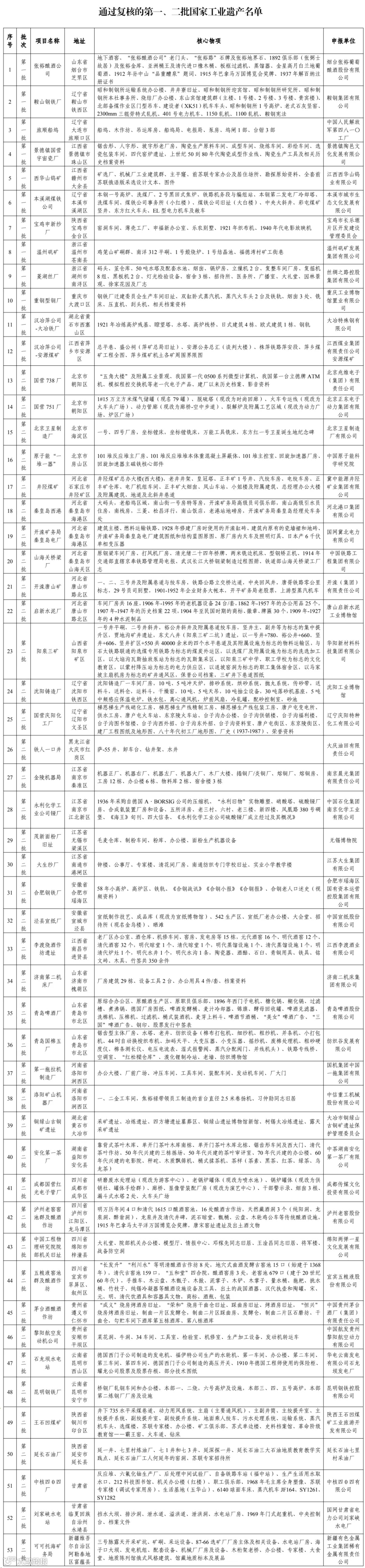 根据《国家工业遗产管理办法》(工信部政法〔2023〕24号)和《工业和信息化部办公厅关于组织开展第六批国家工业遗产认定和第一批、第二批复核工作的通知》(工信厅政法函〔2023〕359号),经自主申报、地方工业和信息化主管部门与中央企业推荐、形式审查、专家评审、现场核查及社会公示等程序,确定了第六批国家工业遗产和通过复核的第一批、第二批国家工业遗产名单,现予以公布。