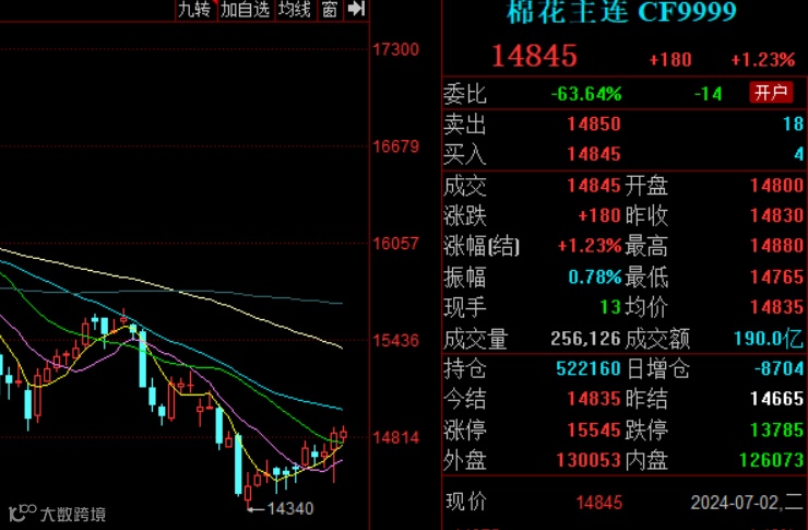 近一周多来,郑棉开启震荡反弹节奏,不仅疆内仓储皮棉基差报价、一口价随之小幅报涨,这也符合我们上月月底的预判。7月2日,郑棉主力合约收于14845元/吨,涨180元/吨,涨幅1.23%。