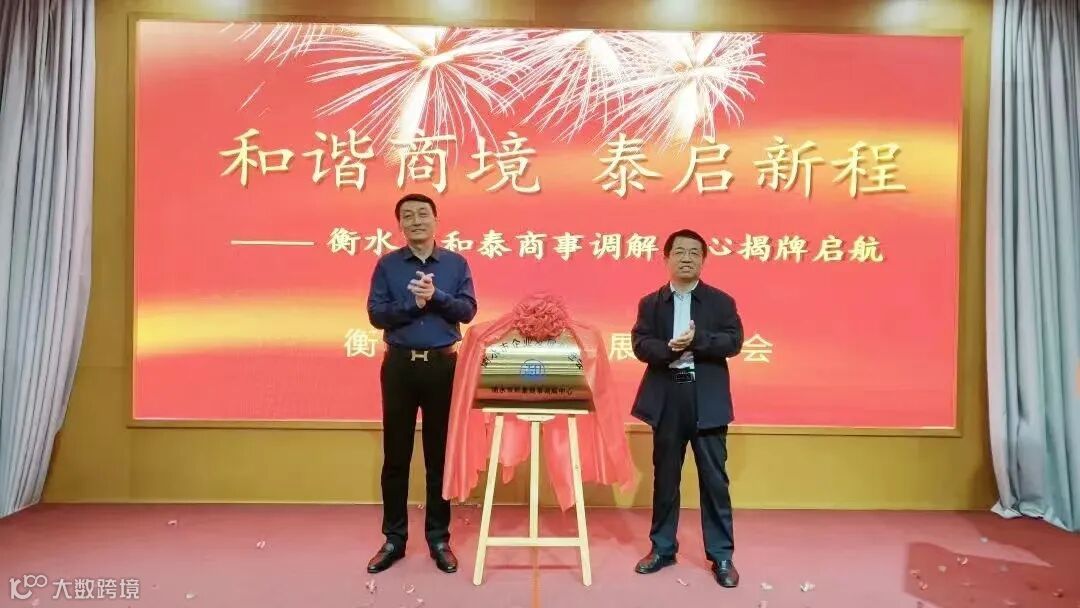 市司法局副局长赵玉虎和市企业发展促进会会长、市和泰商事调解中心法人吴振中共同为“衡水市和泰商事调解中心”揭牌。