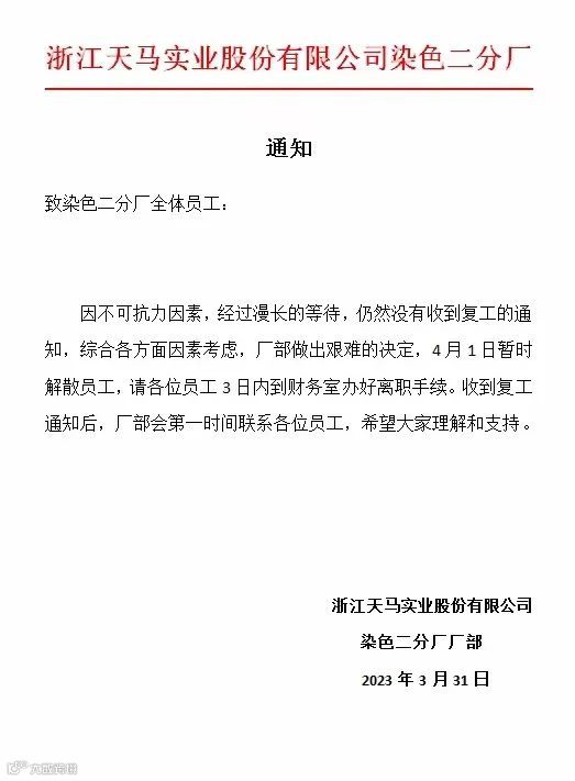 浙江天马实业股份有限公司染色二分厂发布通知:因不可抗力,做出艰难决定,4月1日暂时解散员工。