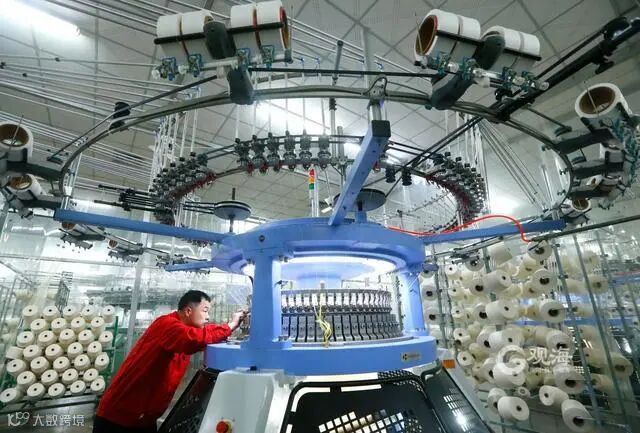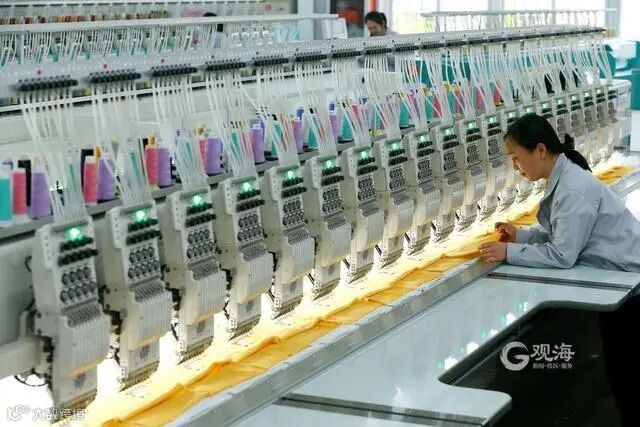即墨区龙山街道一家纺织企业的工人在生产出口到海外市场的服装面料
