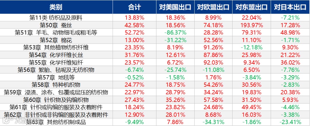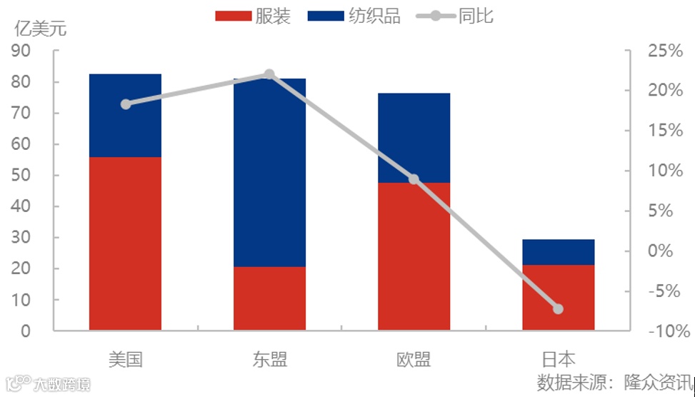 对东南亚出口则是以纺织原料为主,可以占到整个出口量的74.5%。目前随着东南亚服装产业的蓬勃发展以及当地优惠的税收、关税以及人力优势,正在逐渐成为新的纺织服装主要出口地区。