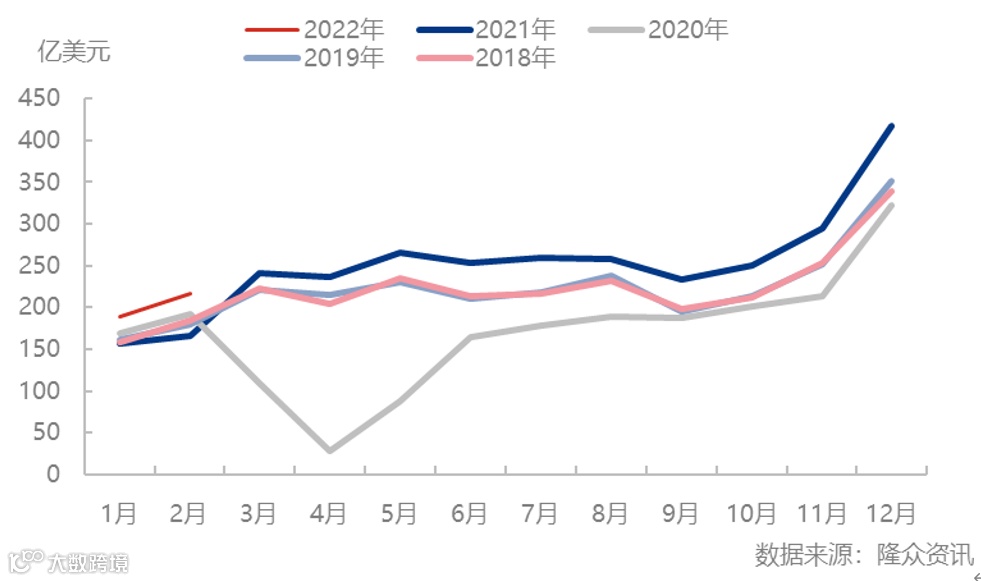 从美国国内需求数据来看,1-2月份美国服装零售数据仍然延续上涨态势,并且数据处于5年最高水平。但是从增速水平来看,2022年1-2月平均增速在25.64%,较2021年下半年平均33.04%的增速水平出现下滑。