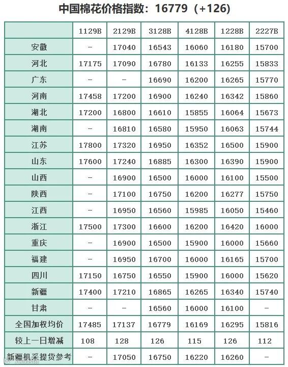 中国棉花价格指数发布三个代表品种CC Index3128B、CC Index2129B、CC Index2227B,分别代表国内棉花现货的“高、中、低”等级的实际到厂成交价。其中CC Index3128B是白棉3级、长度28毫米、马克隆值B级代表标准级(中等级)棉花;CC Index2129B为白棉2级、长度29毫米、马克隆值B级,代表高等级的棉花;CC Index2227B为淡点污棉2级、长度27毫米、马克隆值B级,代表低等级的棉花。发布三个代表品种的同时还发布1129B、1228B、4128B的价格以及分省数据。新标准下中国棉花价格指数发布的价格,除颜色级、长度级和马克隆值级外,其它指标限定为长度整齐度中等、断裂比强度中等、轧工质量中等、异性纤维含量低。