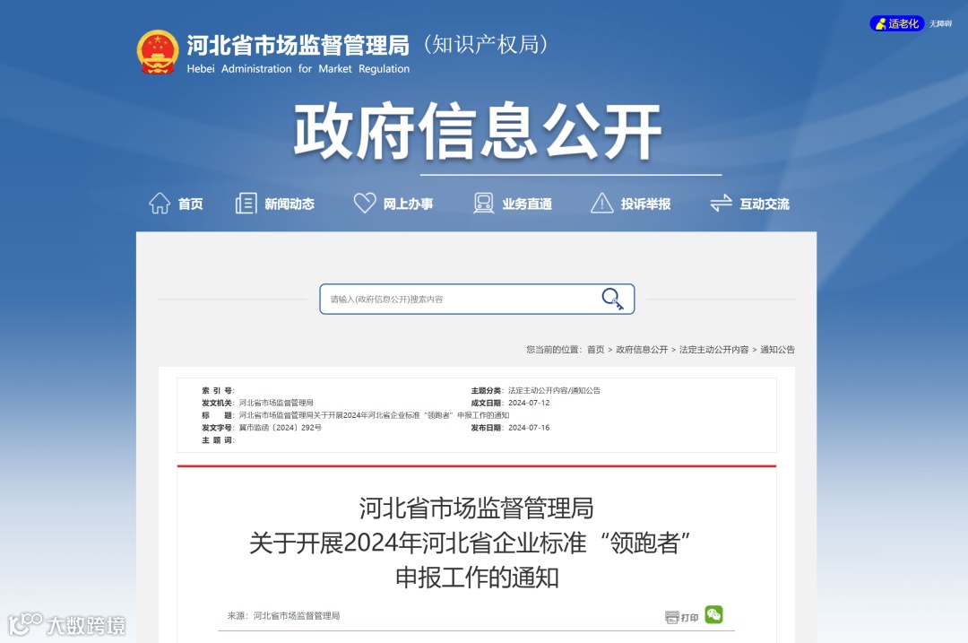 河北省市场监督管理局发布通知开展2024年河北省企业标准“领跑者”申报工作,8月5日截止,详情如下: