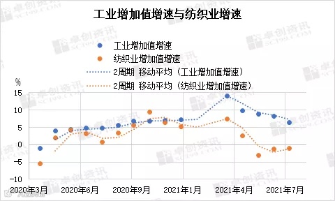 近几年国内纺织业增加值增速与工业增加值增速变化趋势较为一致,二者相关系数为0.79。从二者走势图可以看出,2020年纺织业与整体工业同步稳步恢复。但进入2021年以来,整体工业增加值增速高开低走,其中纺织业增速较整体工业增加值增速平均落后8.54个百分点。