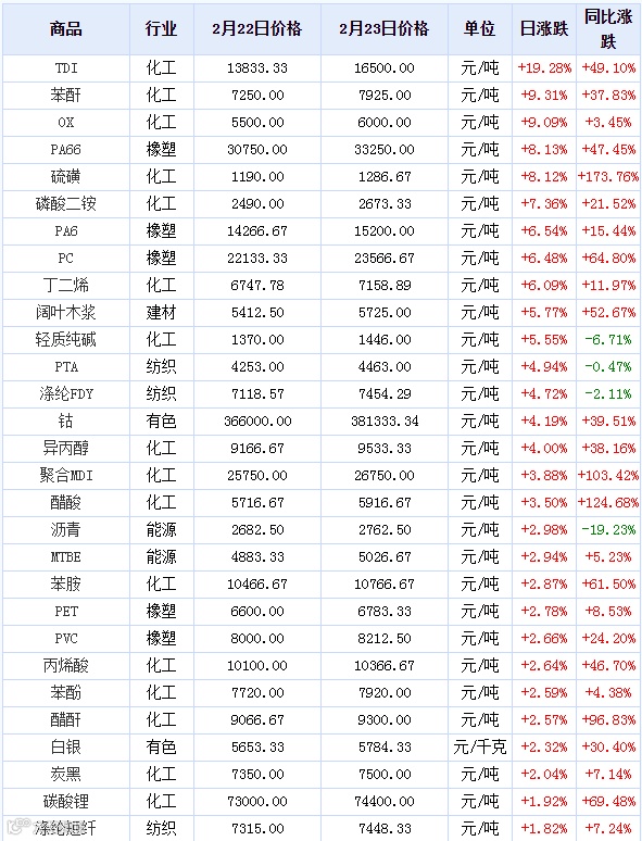 据生意社价格监测,2021年2月23日沪深原材料价格涨跌榜中环比上升的商品共57种,集中在化工板块(共23种)和有色板块(共10种),涨幅在5%以上的商品主要集中在化工板块;涨幅前3的商品分别为TDI(19.28%)、苯酐(9.31%)、OX(9.09%)。当日均涨跌幅为1.42%。