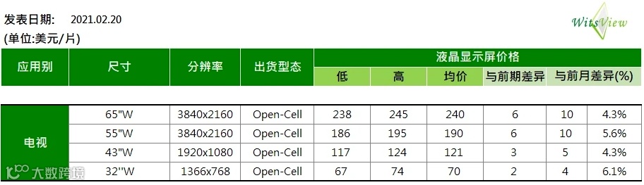 多家调研机构日前发布了TV面板涨价风向标简报,预期全球LCD TV面板市场供应紧张局面将延续至二季度。供应持续紧张,推动头部面板厂商价格策略转为激进,LCD TV主流尺寸产品2月至3月价格将维持较大涨幅。