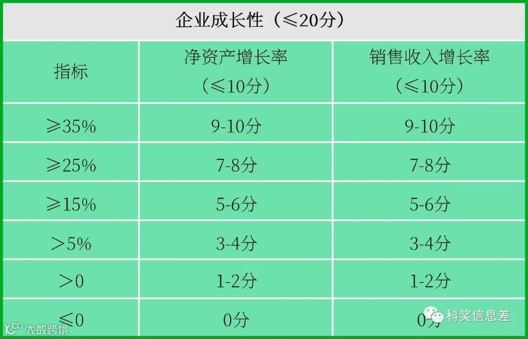 ①企业成长性指标在创新能力评价中占20分,其中销售收入增长率和净资产增长率各占10分,净资产、销售收入年平均增长率达35%以上可获得满分。