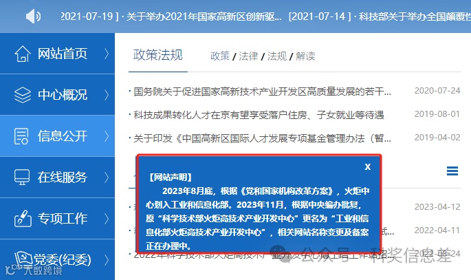 2023年11月,根据中央编办批复,原“科学技术部火炬高技术产业开发中心”更名为“工业和信息化部火炬高技术产业开发中心”,相关网站名称变更及备案正在办理中。