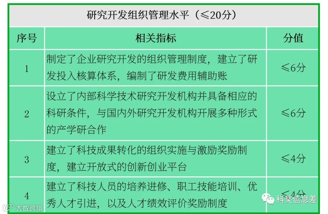 由技术专家根据企业研究开发与技术创新组织管理的总体情况,结合以下几项评价,进行综合打分: