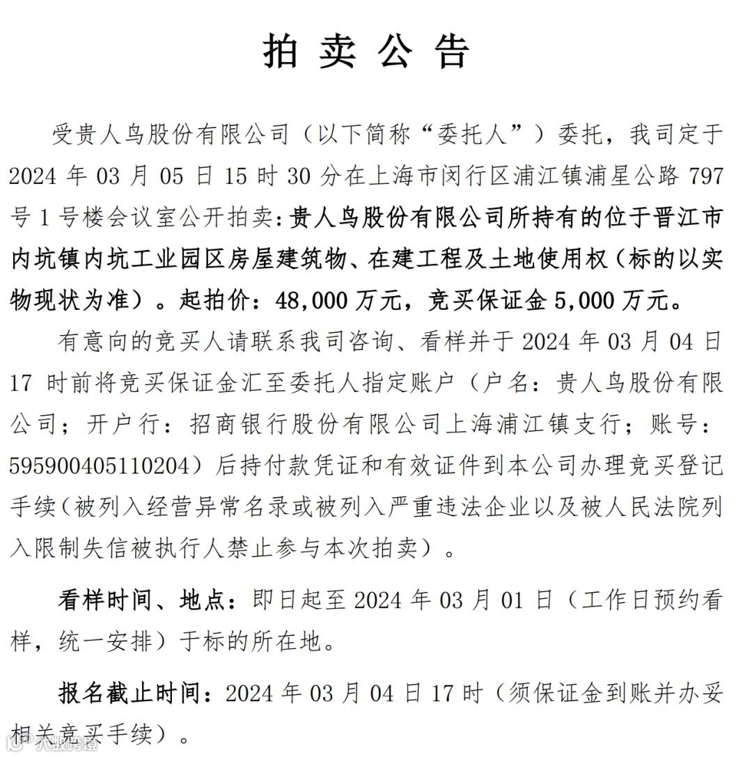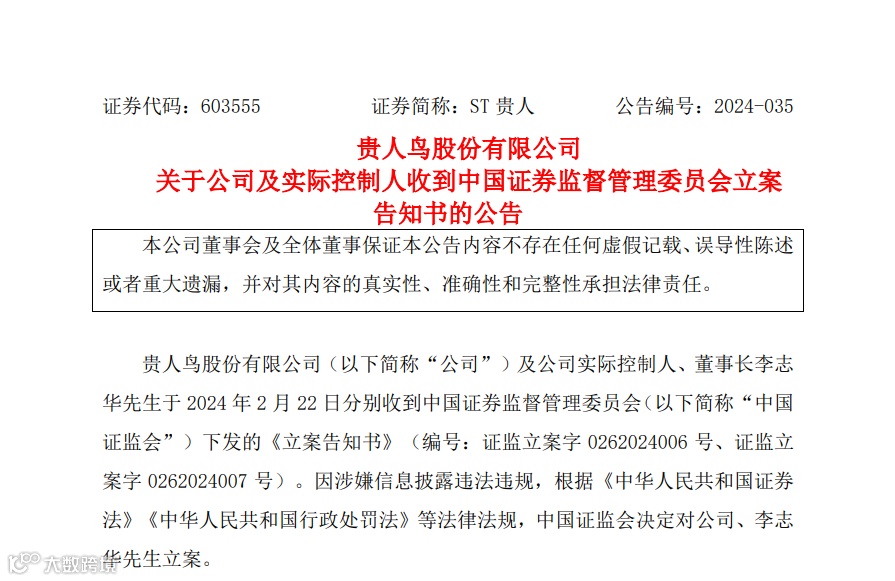 公告显示,贵人鸟股份有限公司及公司实际控制人、董事长李志华于2月22日分别收到中国证监会下发的《立案告知书》。因涉嫌信息披露违法违规,根据《中华人民共和国证券法》《中华人民共和国行政处罚法》等法律法规,中国证监会决定对公司、李志华立案。