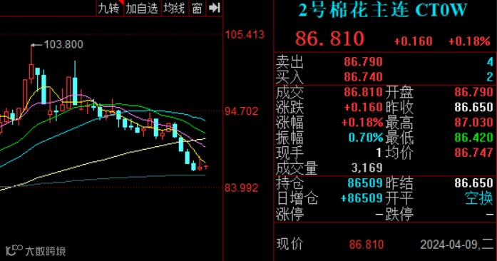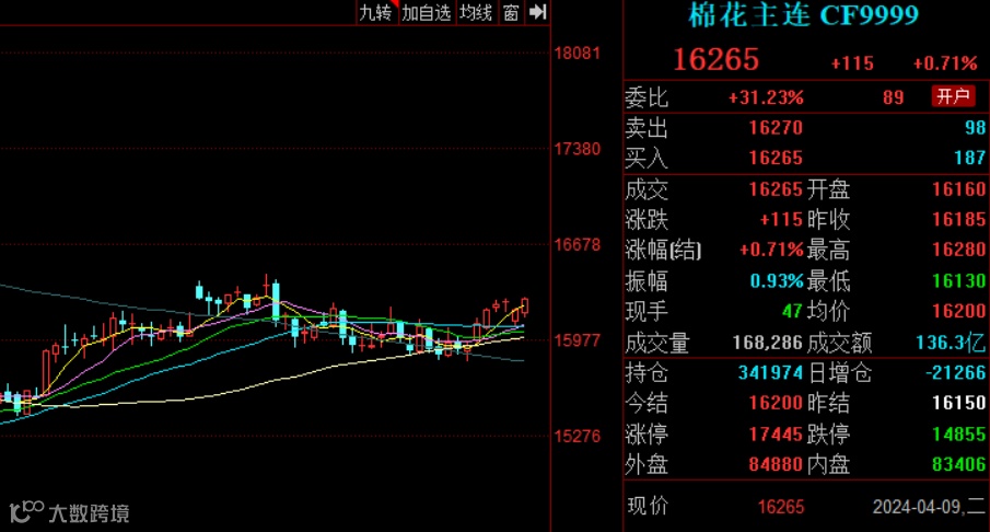 上周,正逢清明假期,交易日仅有3天,期间郑棉交易重心明显抬升,主力05合约最高达16270元/吨,创3月以来新高。从市场运行情况来看,宏观层面国内持续出台利好政策、3月PMI指数超预期以及随着春播陆续展开新年度植棉面积减少的预期,对郑棉市场形成一定支撑。4月9日,郑棉主力合约收16265元/吨,涨115元/吨。