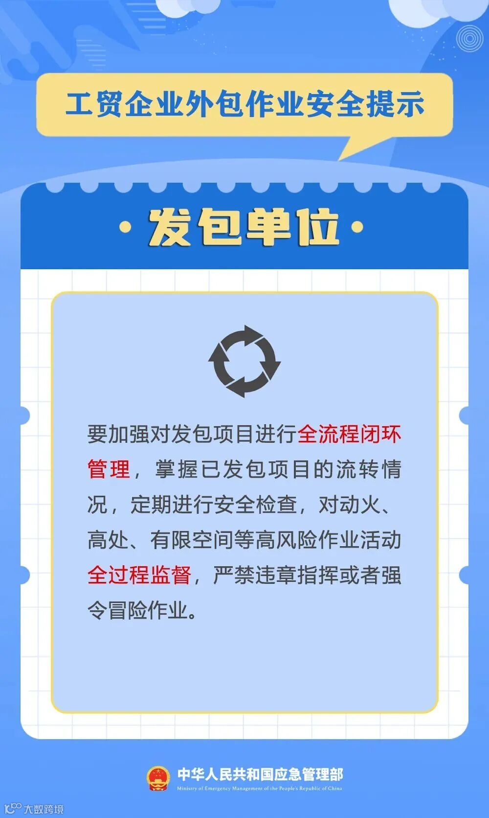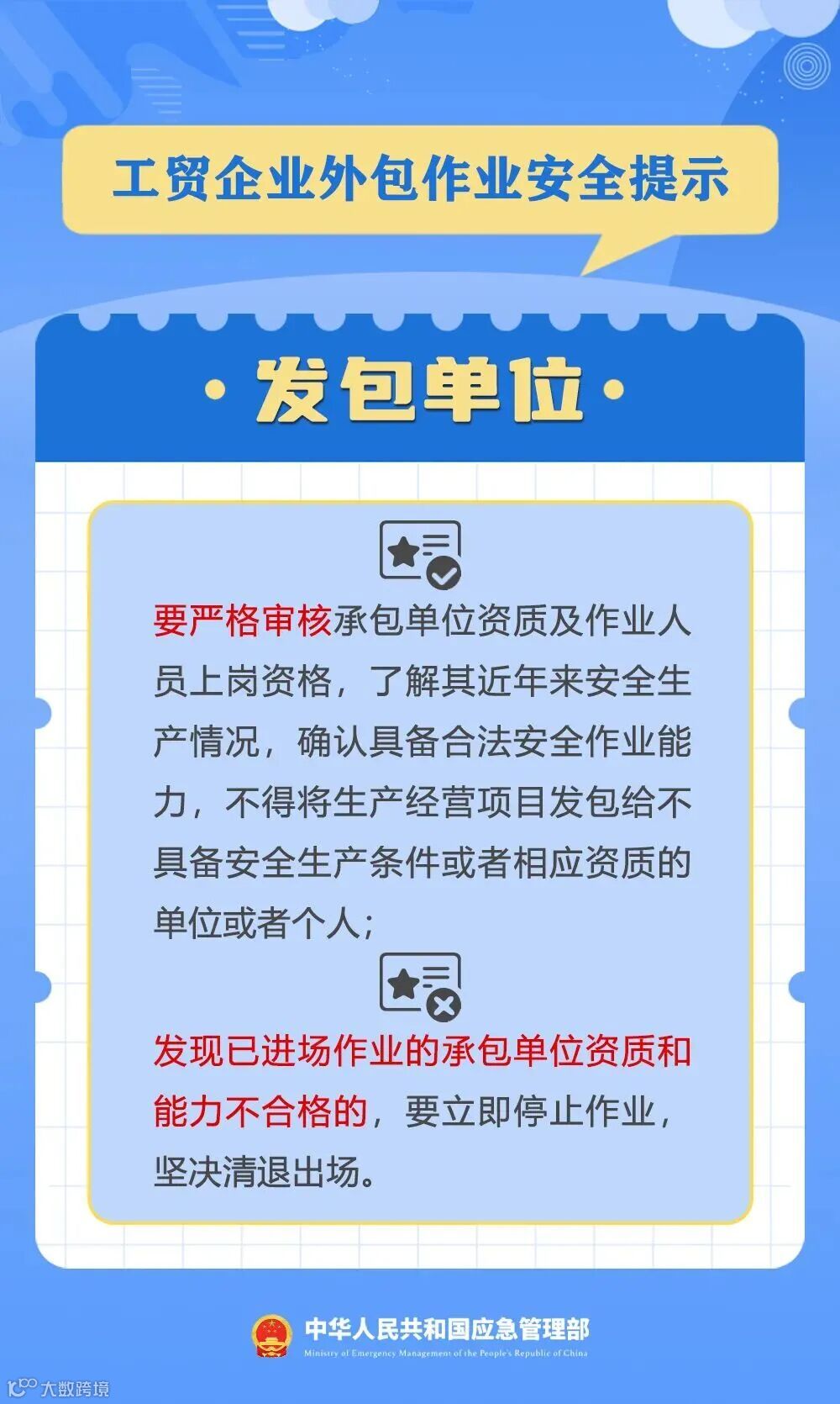 2025年10月以来,全国工贸企业共发生3起较大生产安全事故,均是由于外包作业漏管失控导致,教训十分深刻。为推动各地和相关企业加强外包作业安全管理,有效防范遏制事故发生,应急管理部向工贸企业发出外包作业安全提示。