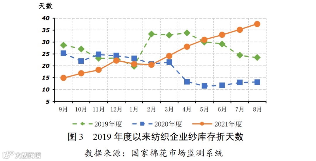 下游成品去库存仍未完成。据国家棉花市场监测系统《中国棉花工业库存报告》调查显示,8月初,被抽样调查企业纱产销率为89.8%,同比下降3.6个百分点,比近五年同期平均水平下降 4.8 个百分点;库存为37.6天销售量,同比增加24.5天,比近五年同期平均水平增加 19.1天。虽然近期纱产销率有所提高,但纺织企业成品库存仍居高位,原料补库力度仍然较小。