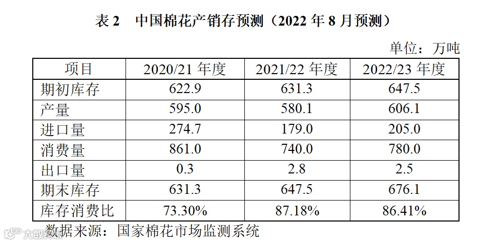 基于相关专题调查和对国内外经济环境及市场状况的分析,本期国家棉花市场监测系统对2021年度和2022年度中国棉花产销存预测维持上期观点: