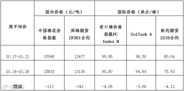 上周,国内部分地区疫情反复,纺织需求受影响较大,下游新增订单不足,企业开机率出现下降,原料采购有所减少,棉价持续走低;国际棉价受欧美通胀加剧、紧缩预期增强、欧洲央行加息等因素影响连续下跌,跌幅大于国内,内外棉价差继续收窄。中国棉花价格指数(CCIndex3128B)周均价为15833元/吨,环比下跌113元;Cotlook A指数周均价94.84美分/磅,环比下跌3.66美分,1%关税下折人民币16205.8元/吨(含200元/吨港口费用),较中国棉花价格指数(CCIndex3128B)高373元,价差缩小505元;郑州期货主力合约CF301周均价13136元/吨,环比下跌341元;ICE棉花期货近期合约周均价75.93美分/磅,环比下跌4.11美分。
