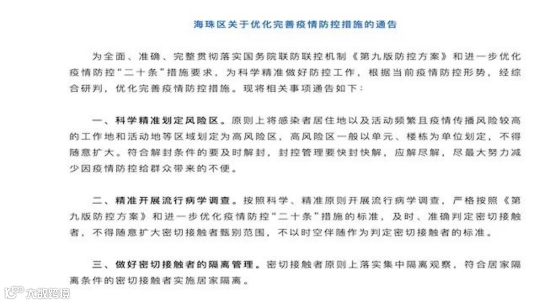 一夜之间,广州迎来了前所未有的利好消息。就在国务院联防联控发布封控管理要快封快解,应解尽解措施后。广州海珠表示,为全面、准确、完整贯彻落实国务院联防联控机制《第九版防控方案》和进一步优化疫情防控“二十条”措施要求,为科学精准做好防控工作,根据当前疫情防控形势,经综合研判,优化完善疫情防控措施。