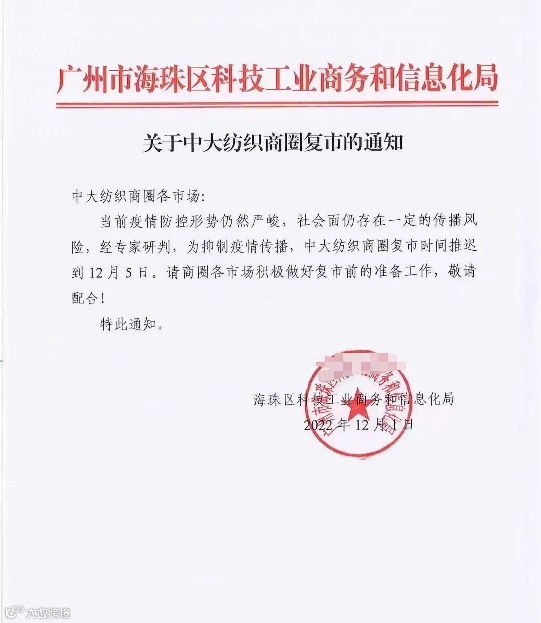 12月1日,广州海珠区科技工业商务和信息化局发布《关于中大纺织商圈复市的通知》中大市场复市时间确定为12月5日,这让沉浸在疫情严峻下的广州人民欢呼雀跃,也意味着,广州将率先打响“封控管理快封快解,应解尽解”政策。