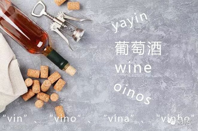 葡萄酒的英文单词“wine”源于闪族语的“yayin”一词。在阿拉伯语中,葡萄酒是“wain”,在希腊语中是“oinos”,在罗马语中是“vin”、“vino”、“vina”或“vinho”。