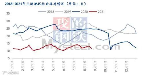 图:2018-2021年主流地区纺企库存情况