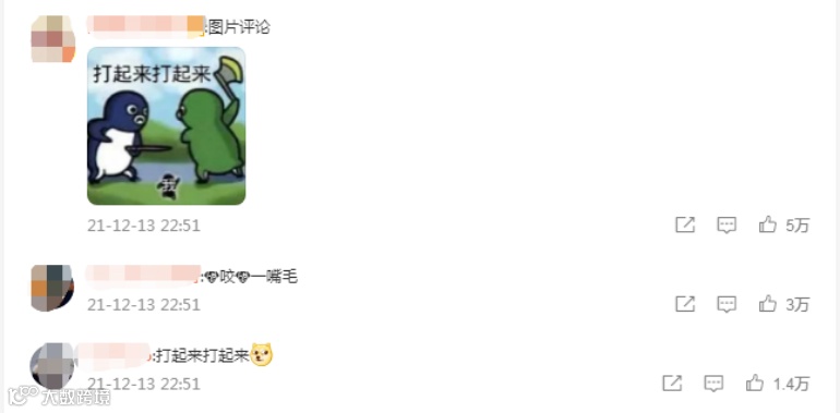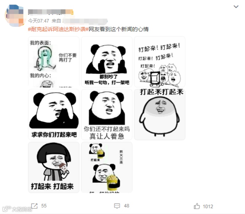 在#耐克起诉阿迪达斯抄袭#话题下,一条“打起来”的图片评论收获5万点赞。