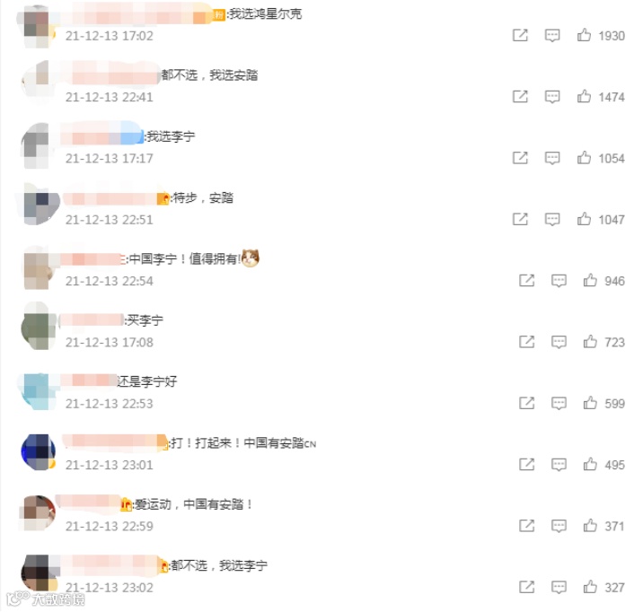 还有网友表示,耐克阿迪达斯随便斗,自己只支持国产运动品牌。