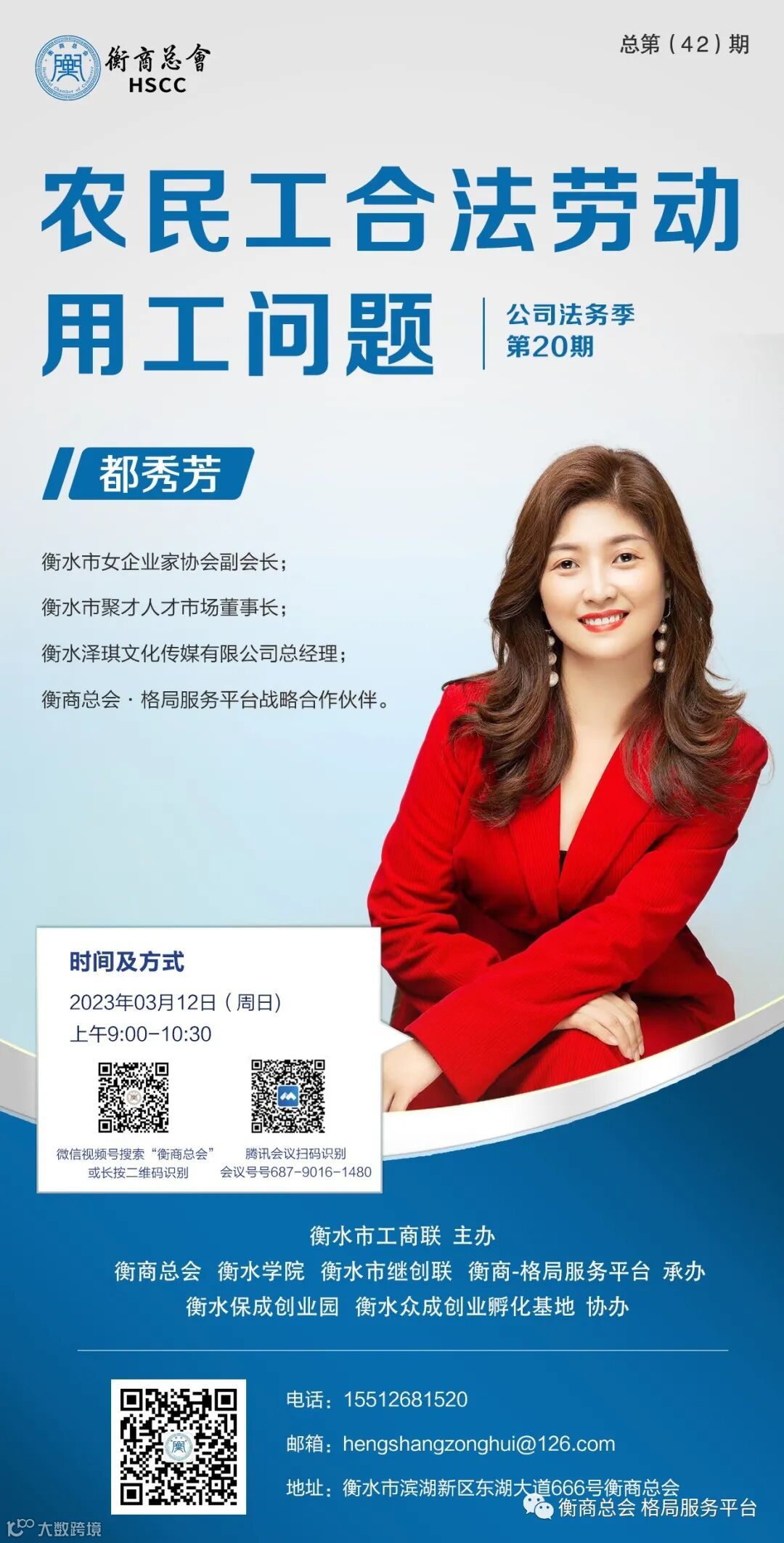 3月12日(本周日)上午9点,衡商云课堂之“公司法务季”第20期(总第42期)讲座主题《怎样解决农民工合法用工问题 》。主讲嘉宾都秀芳,