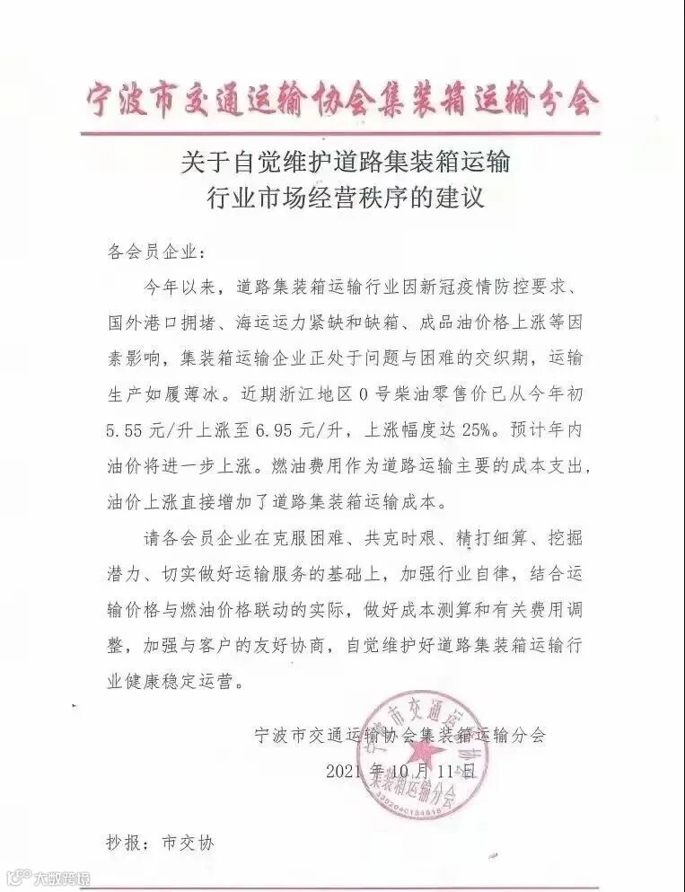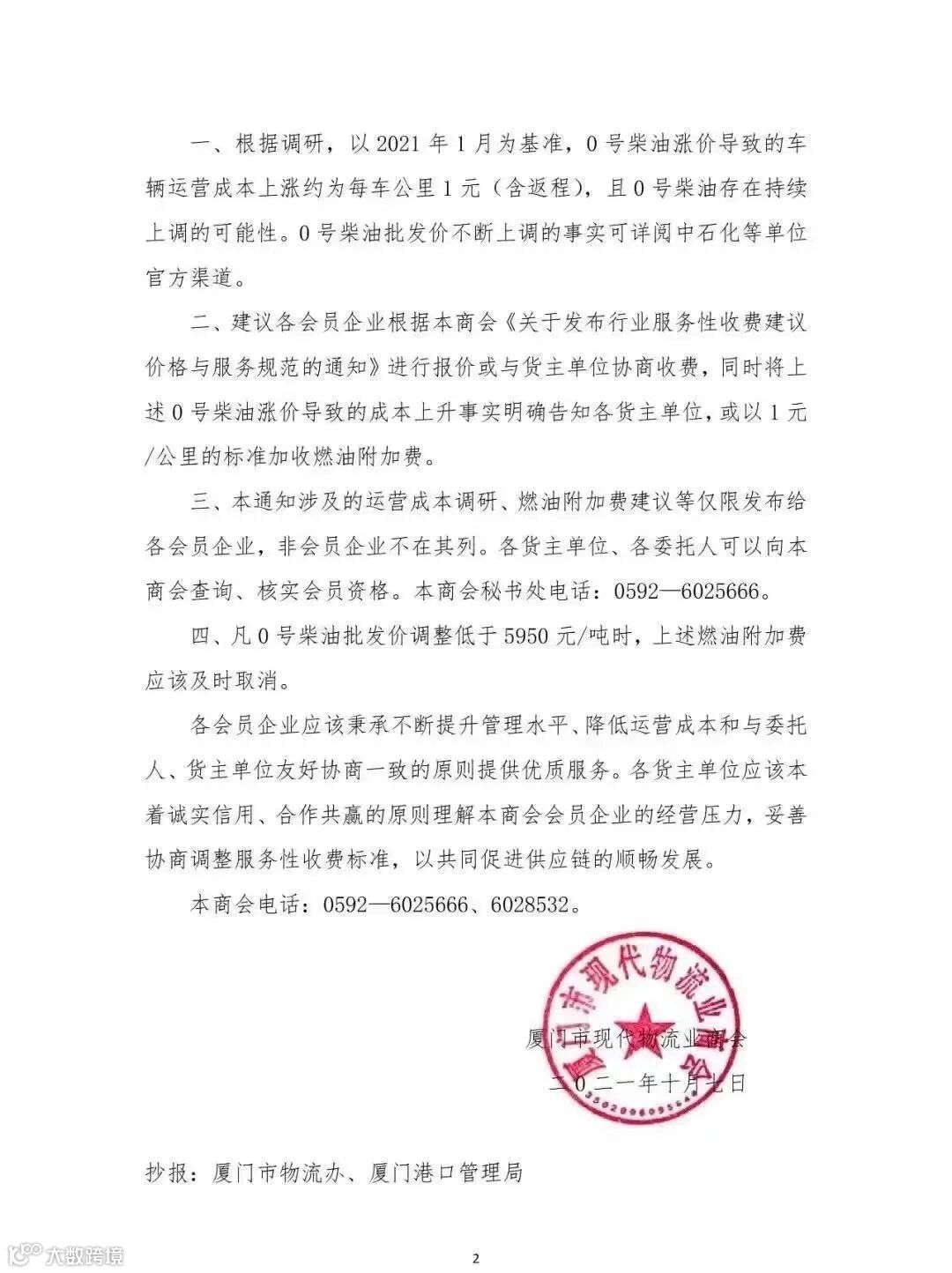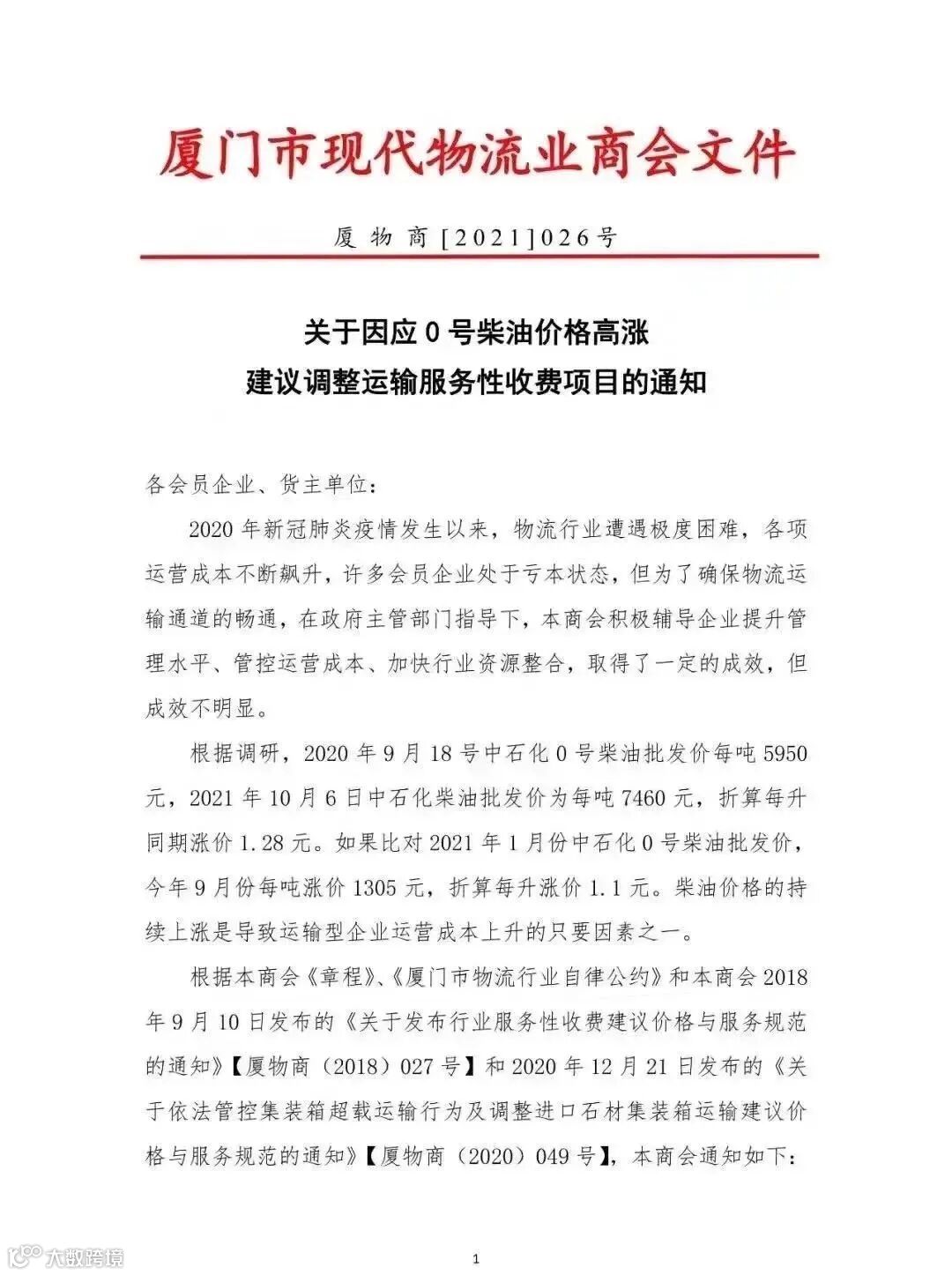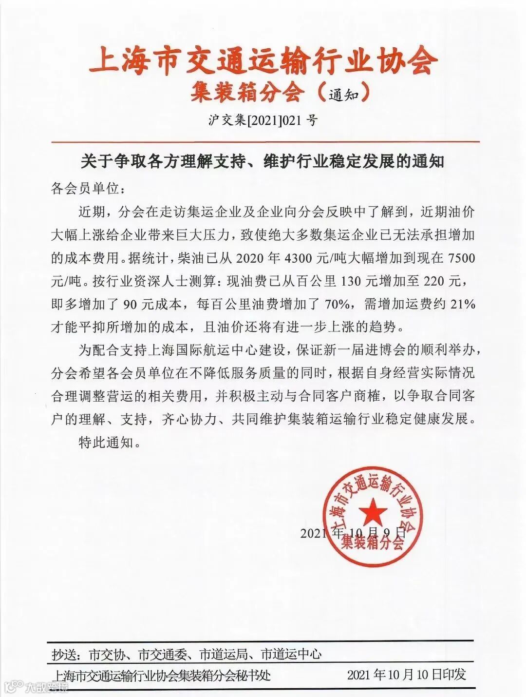 目前,深圳、上海、宁波等口岸交通运输行业协会及厦门现代物流商会等已陆续发出公告,建议各方理解支持,友好协商运价上涨,维护行业稳定发展。