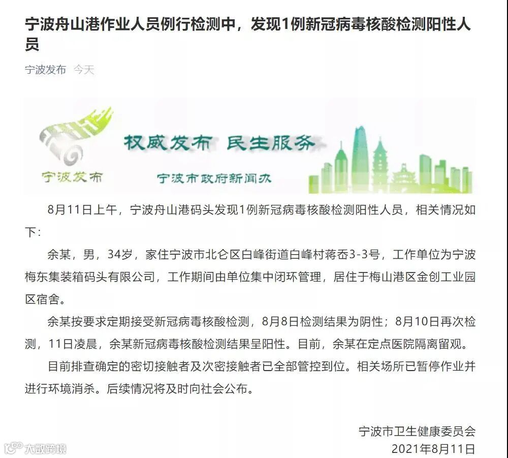 8月11日上午,宁波舟山港码头发现1例新冠病毒核酸检测阳性人员,为宁波梅东集装箱码头捆扎工。目前排查确定的密切接触者及次密接触者已全部管控到位。相关场所已暂停作业并进行环境消杀。