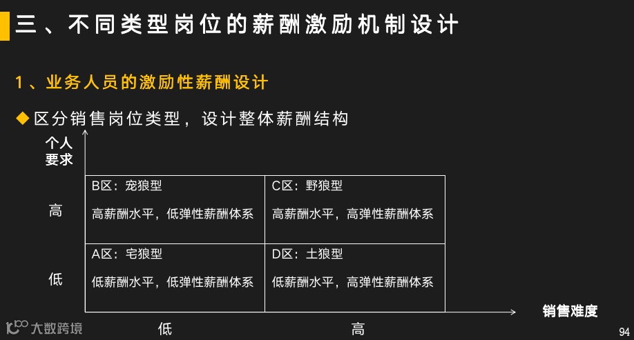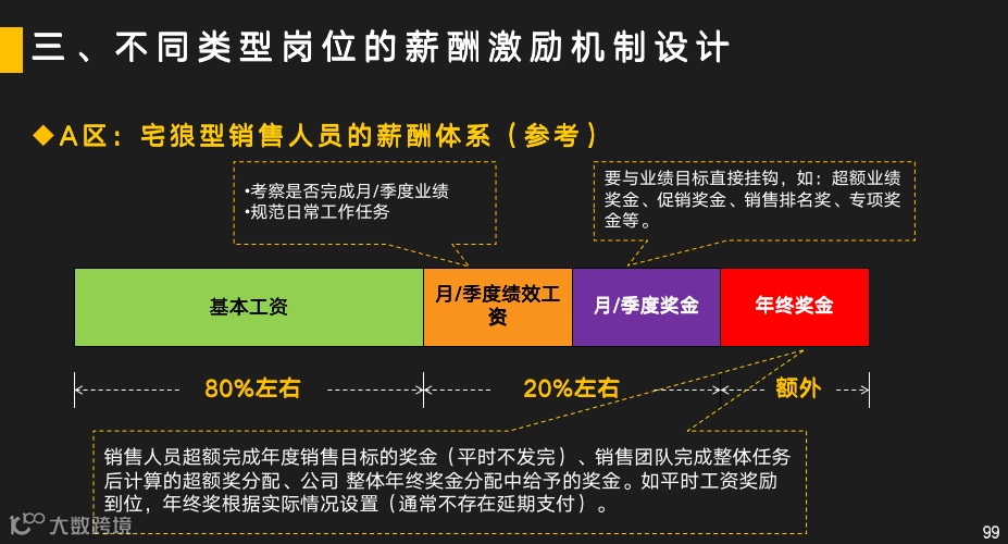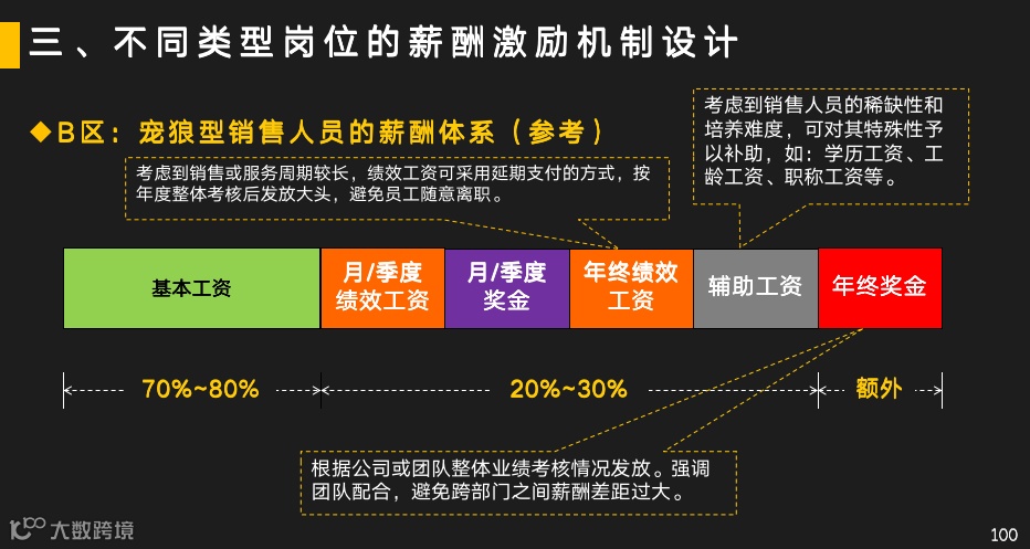 土狼型的薪酬体系,则由50%—60%的基本工资,40%—50%的绩效和奖金构成。