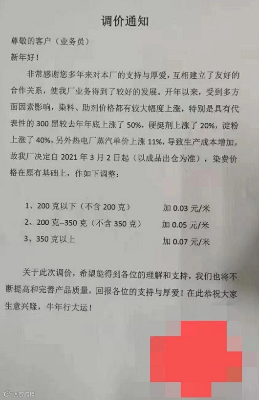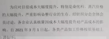 来自国内部分印染集聚区的印染厂开始启动染费上调模式: