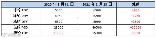 实际从2020年下半年开始,由于“输入性通胀”,纺织市场内各类原料价格就已经开始涨起来了,涤纶长丝上涨了超过1000元/吨,氨纶更是上涨了超过10000元/吨,让纺织人直呼吃不消。