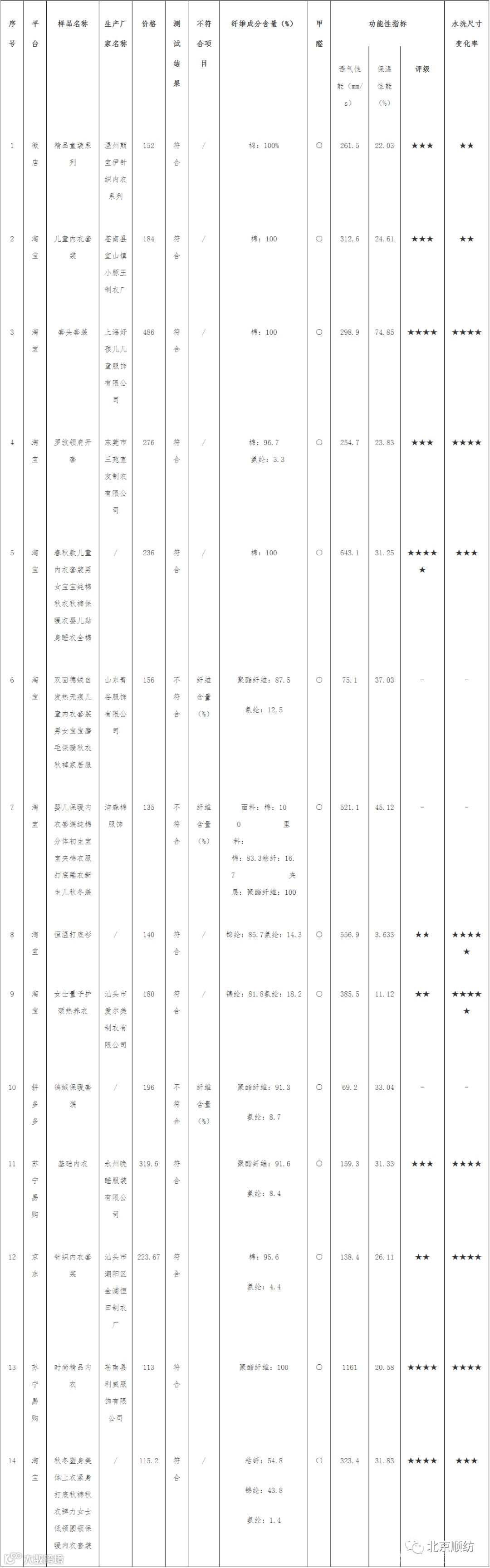 本次比较试验测试方法参照了GB18401-2010《国家纺织产品基本安全技术规范》、GB/T29862-2013《纺织品纤维含量的标识》、GB/T5453-1997《纺织品织物透气性的测定》、FZ/T73022-2012《保暖针织内衣》、GB/T20944.3-2008《抗菌性能的评价第3部分:振荡法》、GB/T21655.1-2008《纺织品吸湿速干性的评定第一部分:单项组合试验法》、GB/T12704.1-2009《纺织品织物透湿性试验方法第一部分:吸湿法》、FZ/T01071-2008《纺织品毛细效应试验方法》、GB/T2660-2017《衬衫》等。
