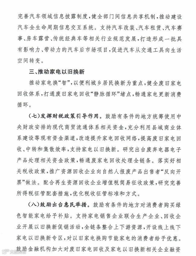 鼓励有条件的地方统筹使用中央财政安排的现代商贸流通体系相关资金,充分利用县域商业体系建设等现有资金渠道,改造提升家电回收网络,提高废旧家电回收、中转和集散效率,支持家电以旧换新。