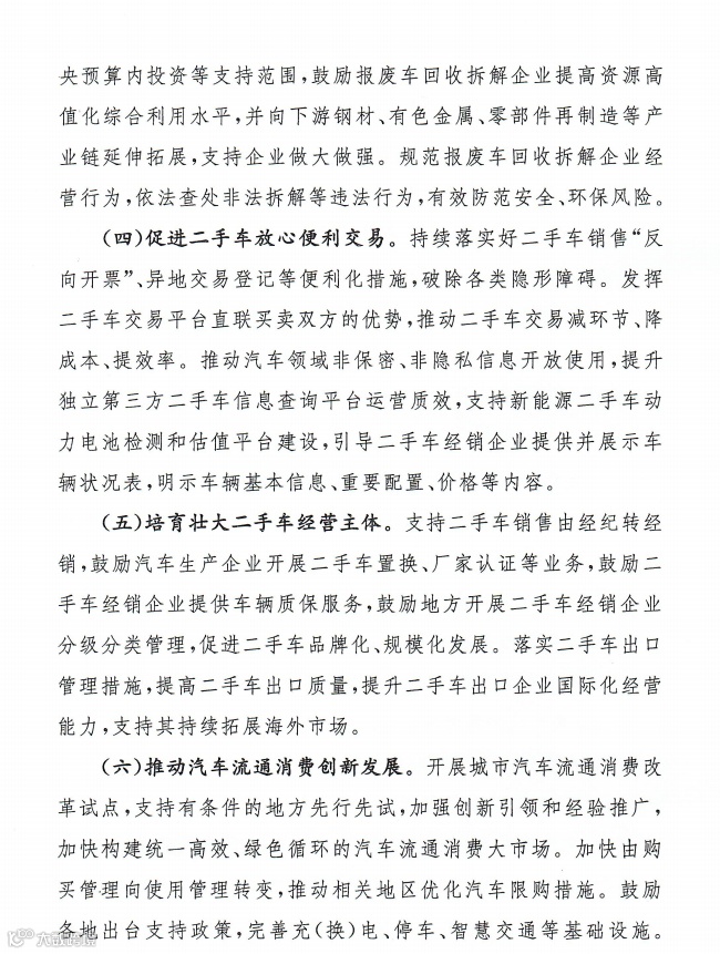 推动汽车领域非保密、非隐私信息开放使用,提升独立第三方二手车信息查询平台运营质效,支持新能源二手车动力电池检测和估值平台建设,引导二手车经销企业提供并展示车辆状况表,明示车辆基本信息、重要配置、价格等内容。