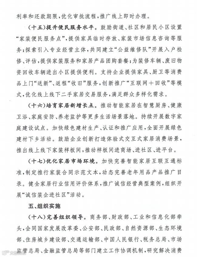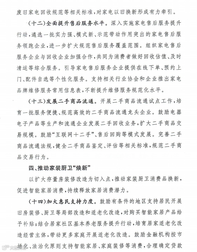 支持企业提供家具、厨卫等消费品上门“送新”、返程“收旧”服务,创新推广“互联网+回收”等模式,优化线上线下二手家居交易服务,满足群众多样化需求。
