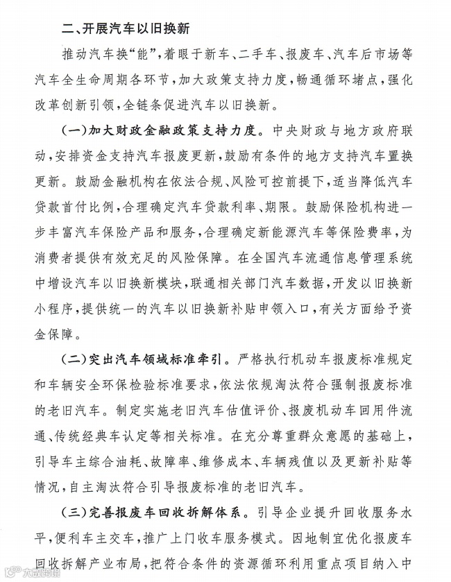 中央财政与地方政府联动,安排资金支持汽车报废更新,鼓励有条件的地方支持汽车置换更新。