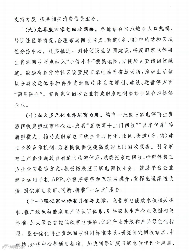鼓励金融机构加大对废旧家电回收及家电以旧换新相关企业融资支持力度,拓展相关消费信贷业务。
