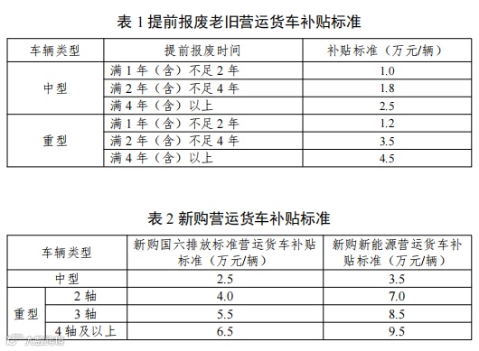 其中,新购国六排放标准营运货车或新能源营运货车补贴标准见表2。报废老旧营运货车提前报废时间不足1年的,可以申请新购营运货车补贴。