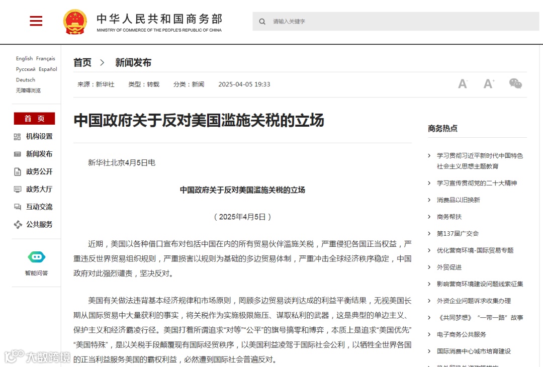4月4日,中方“11箭齐发”,国务院关税税则委员会、商务部、海关总署接连发布多项对美反制措施,包括自4月10日12时01分起,对原产于美国的所有进口商品加征34%关税。