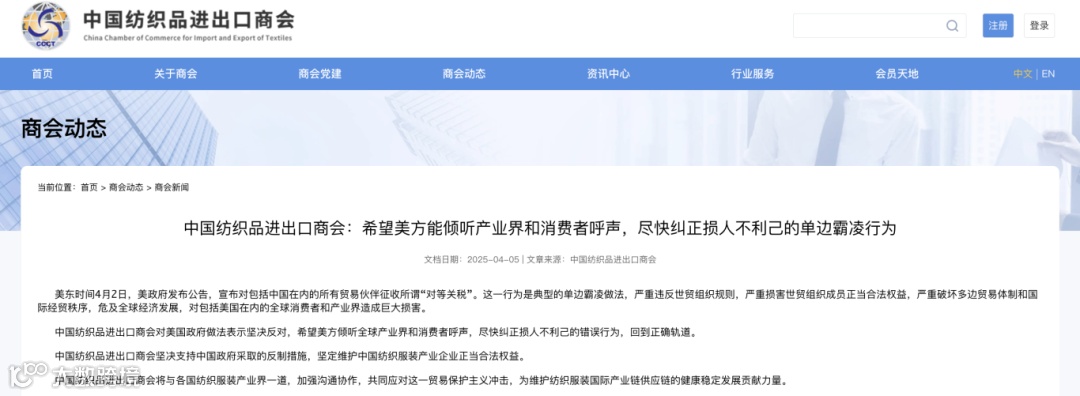 4月5日,中国六大进出口商会针对美征收“对等关税”一事联合发声。中国纺织品进出口商会则希望美方纠正错误行为,支持政府反制,维护纺织服装产业权益。