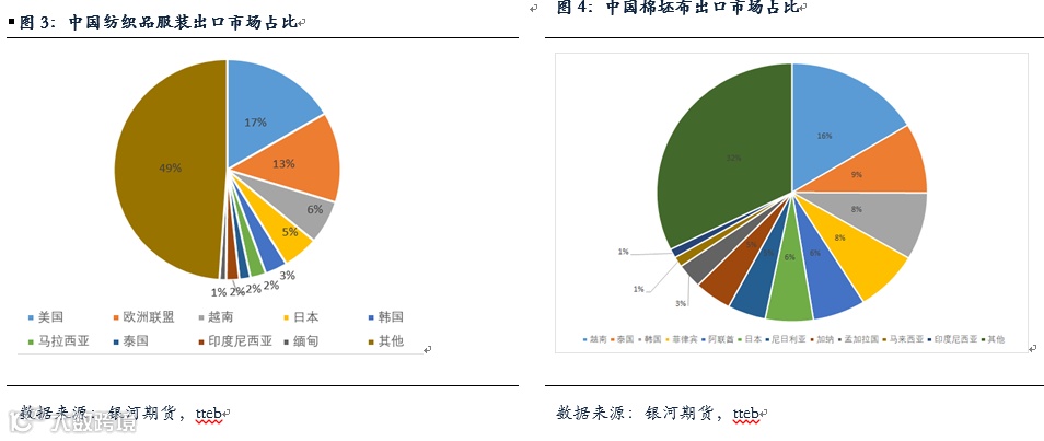 之前美国仅仅对中国的纺织品服装加关税的时候,中国的订单大量转移到其他国家,我们可以看到2024年我们的纺织服装出口市场除了美国、欧盟和日韩这几个大的消费市场外,大部分都出口到了越南、马来西亚、泰国、印尼以及缅甸等东南亚主要的服装出口国,这其中应该有一部分是通过第三国做转口贸易到欧美市场的。另外,我们也可以看到坯布市场的出口都是以南亚、东南亚等国家,这些国家通过进口中国棉坯布制造成服装然后出口到欧美市场。本次美国对南亚、东南亚国家都加征高关税可以说是对中国及其周边的关联市场影响都比较大。