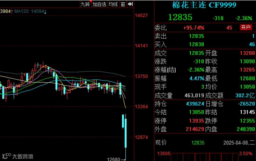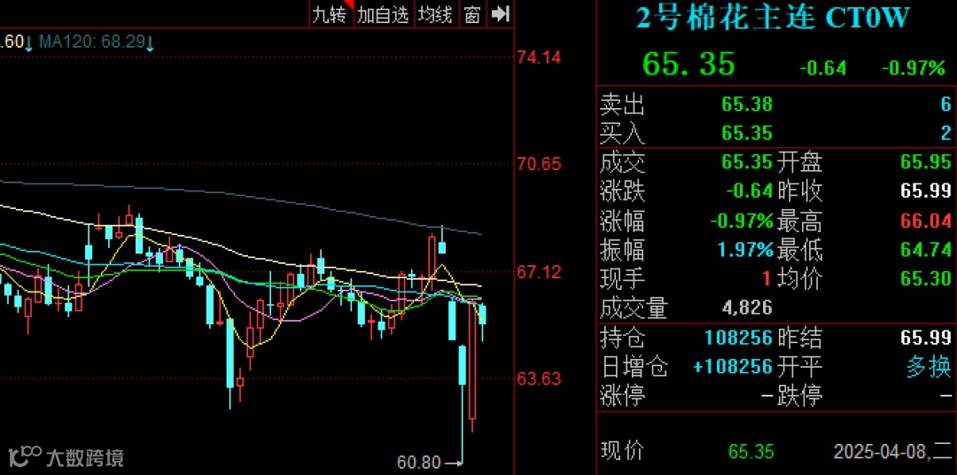 4月4日,中国再度对美国的“对等关税”采取对应措施,国务院关税税则委员会宣布自2025年4月10日起,对原产于美国的进口商品加征34%关税,由此将导致美棉价格出现较大幅度上升,国内纺企将无法接受过高价格的美棉,并且其它高性价比进口棉将替代美棉,这意味着美棉进口中国的机会完全丧失。这引发外盘美棉期货盘中跳水,ICE主力5月期棉盘中触及跌停60.80美分/磅,刷新4年半新低。