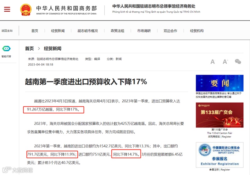 越南经济在2023年一季度遇到的阻力,该国政府很大程度归因于全球经济环境恶化导致的出口下滑。越南统计局在一份声明中表示,越南是世界上最大的服装、鞋类和家具出口国之一,但在2023年第一季度,越南正面临“世界经济不稳定和复杂的发展”。