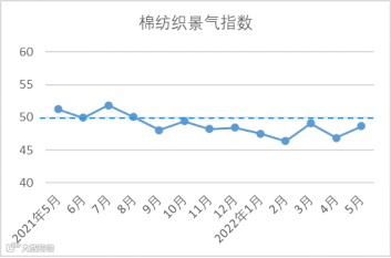 据中国棉纺织行业协会信息,5月,中国棉纺织景气指数为48.64,较4月上升1.79,位于枯荣线下方,行业仍处于欠景气状态。从分类指数看,在构成中国棉纺织景气指数的7项分类指数中,所有指数均较4月上升。其中,除原料采购指数高于枯荣线外,其余指数均位于枯荣线50下方。5月原料采购指数51.39,较4月上升2.62,主要因素为非棉纤维价格的高位运行及采购量回升。