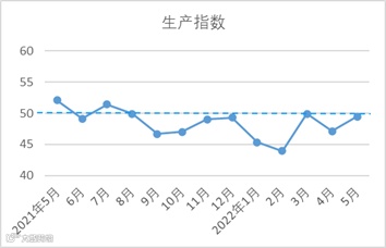5月,生产指数49.47,较4月上升2.33,呈回升态势。据5月31日数据显示,企业复工复产情况较中旬明显好转,产能利用率也有所提升。其中,约57%的企业开台率在90%以上,28%的企业开台率在50-80%。从产品产量看,布产量较4月环比增加,纱产量环比微幅下降,降幅较4月收窄。