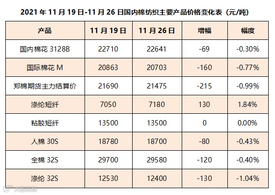 高价新棉销售依旧困难,加工企业开始降价销售,下游纺织企业成品库存积累,生产经营压力加大,国内棉花价格震荡回落。11月26日,代表内地标准级皮棉销售的国家棉花价格B指数22641元/吨,较上周五下跌69元/吨,跌幅0.30%;郑州棉花期货主力合约结算价21475元/吨,较上周五下跌215元/吨,跌幅0.99%。